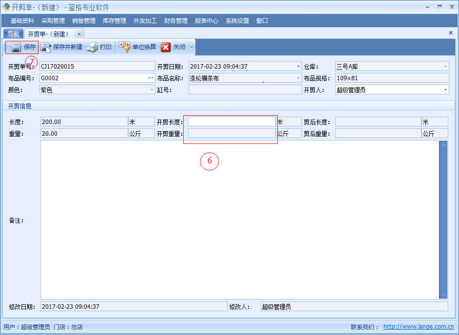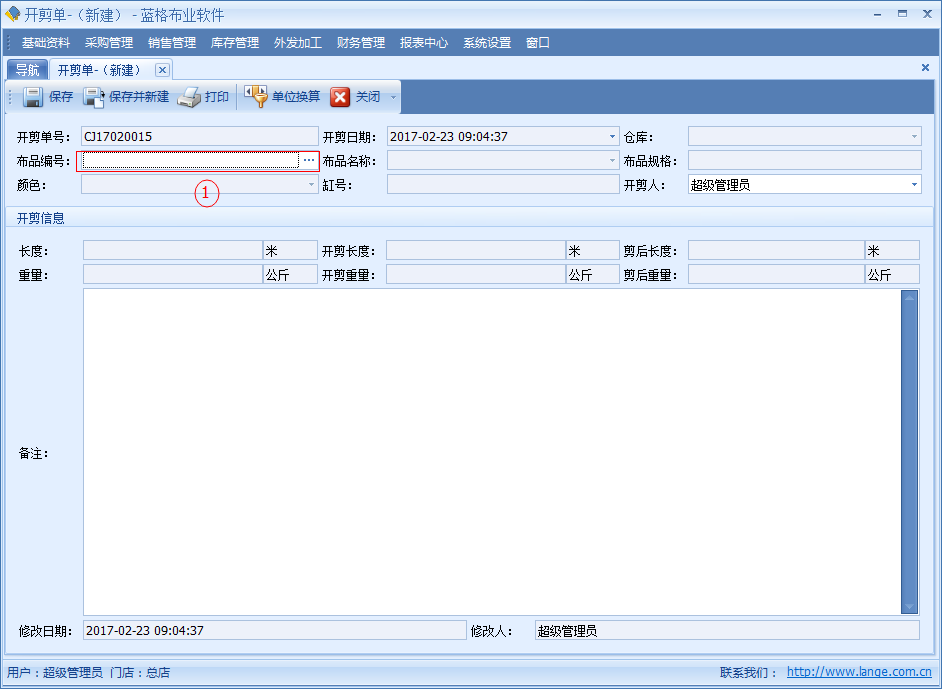 傲藍布匹行業管理軟件,開剪單主要是對庫存里的某一匹布進行開剪。比如:客戶要 150 米,庫存里沒有 50 米長度的布品時,